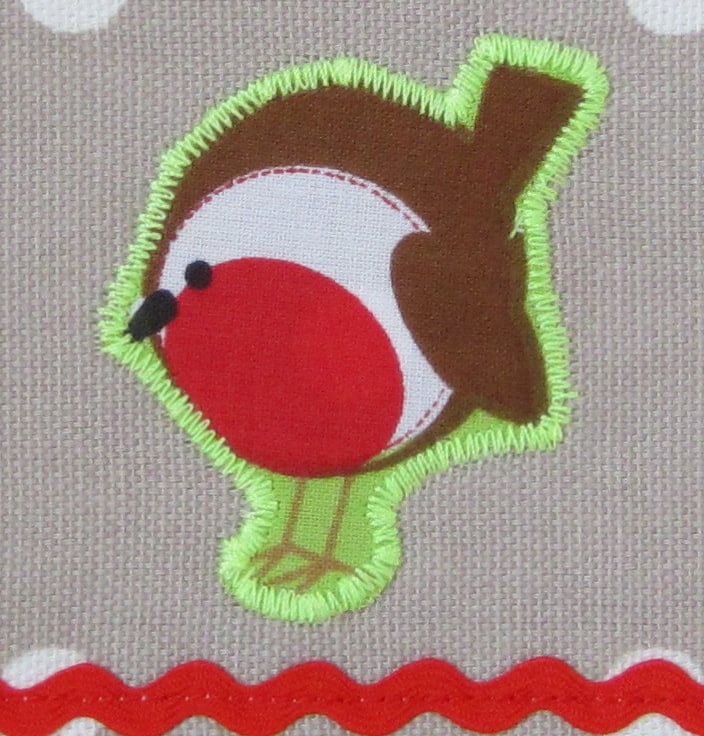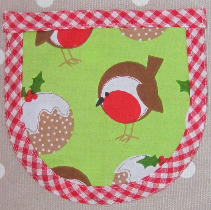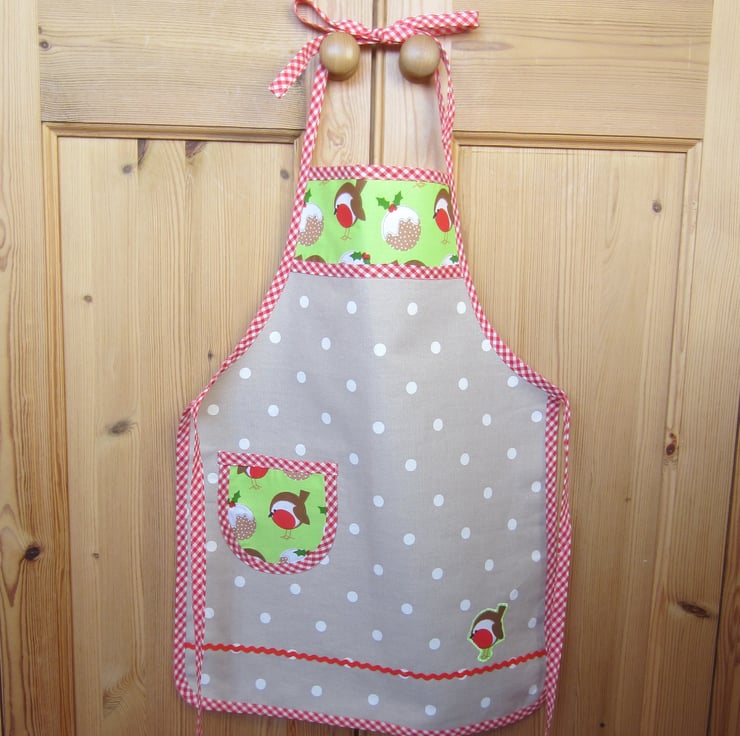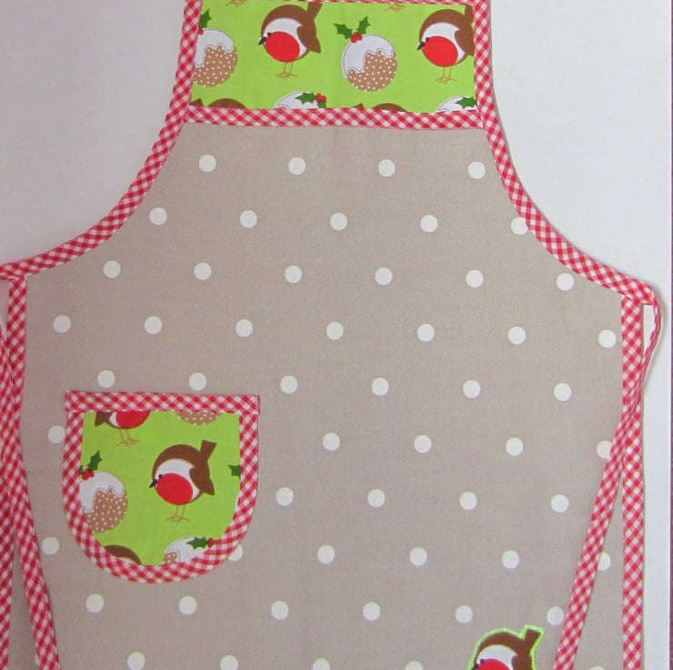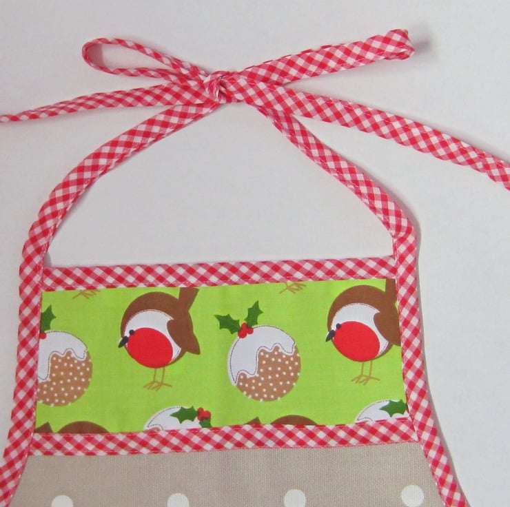 Child's Christmas taupe and white spot apron decorated with robin and Christmas pudding pocket and top panel, appliqued robin and red ric rac. Edged with red and white gingham check. Suitable for a child aged about 4 to 6 years old. It measures 40 cm wide and 52.5 cm long. Fastens at neck and waist with a bow.