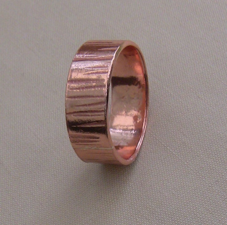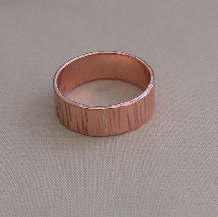 This copper ring is made from 1mm thick copper sheet which has been cross-hammered to give textured surface. It has been soldered together with silver solder which creates a thin silver line. The surface has been treated with metal lacquer to avoid tarnishing. To maintain the sheen you should avoid abrasive polishes and just give it a light rub with a soft cloth.