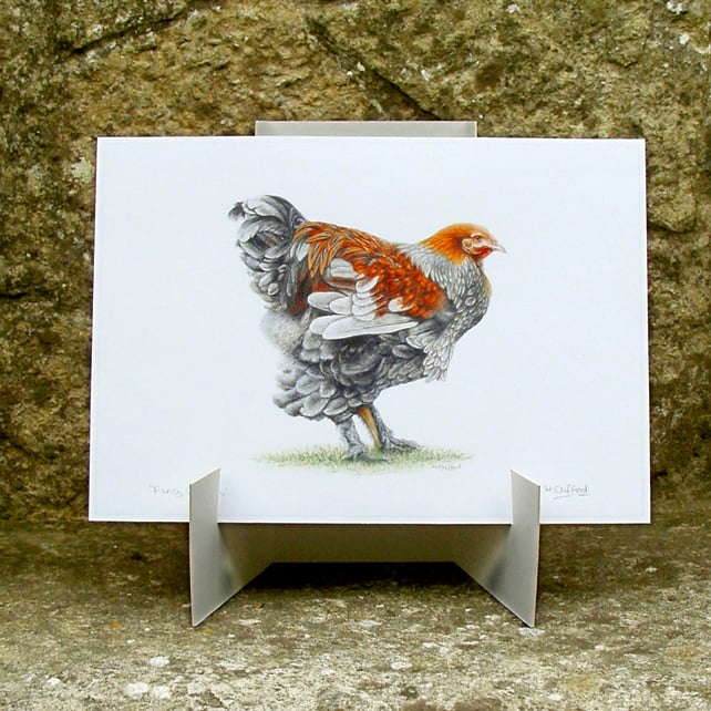 This very fancy feathery chicken is a high-quality fine art print from one of my coloured pencil animal portraits. He is standing side-on to show off his plumage to the best advantage, with his head turning as if to check we are admiring him. There are contrasts in colour between bright orange feathers against dark grey, and in textures between the strong straight flight feathers and the curved fluffy ones on the body. The whole effect is rich and extravagant, and this is emphasised by a white background with just a hint of grass where he is walking.