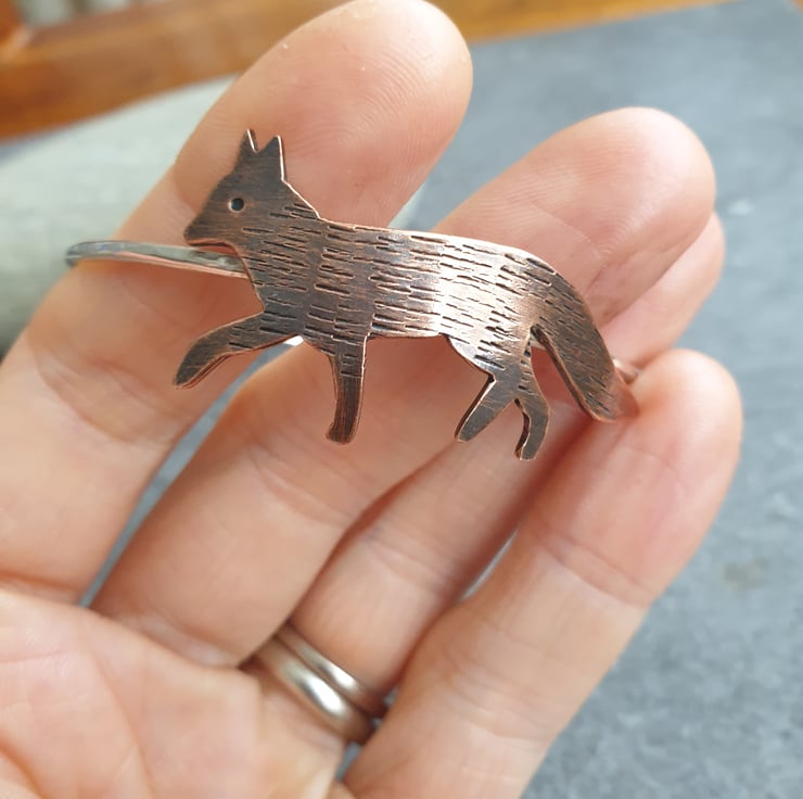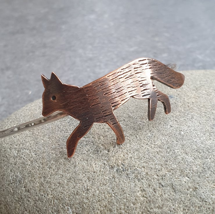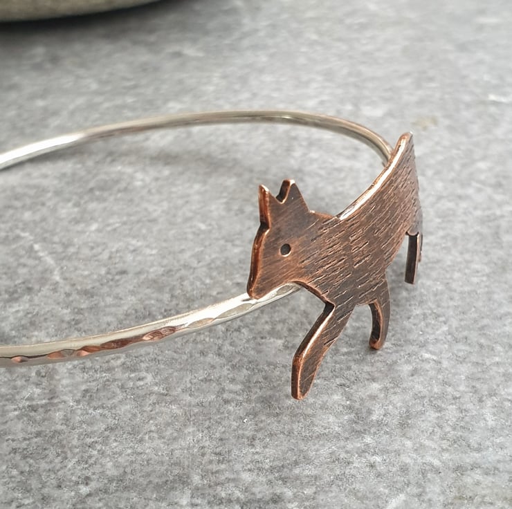 The copper fox bangle features a hand cut textured copper fox which trots around the edge of a slim sterling silver bangle. The bangle has been lightly textured and polished to a shine to catch the light.