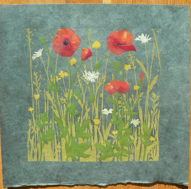 Poppies meadow is handprinted in two layers onto a hand made and dyed lokta paper. No two are ever exactly the same.
