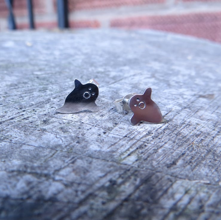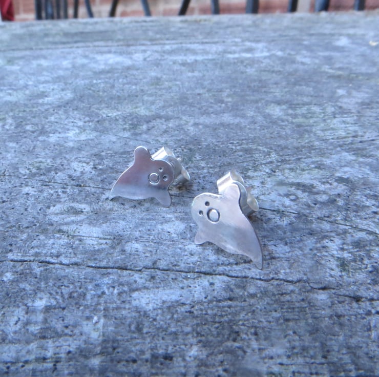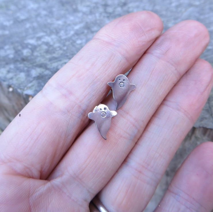 Tiny cute ghost stud earrings handmade from sterling silver; they have been cut, smoothed and polished, and sterling silver ear posts soldered to the back.