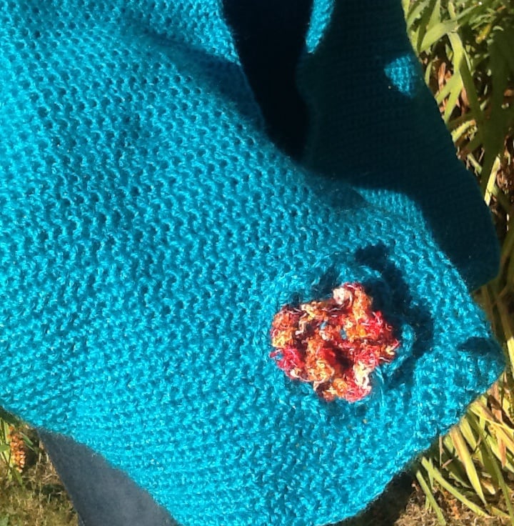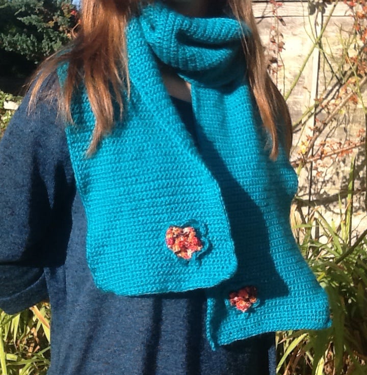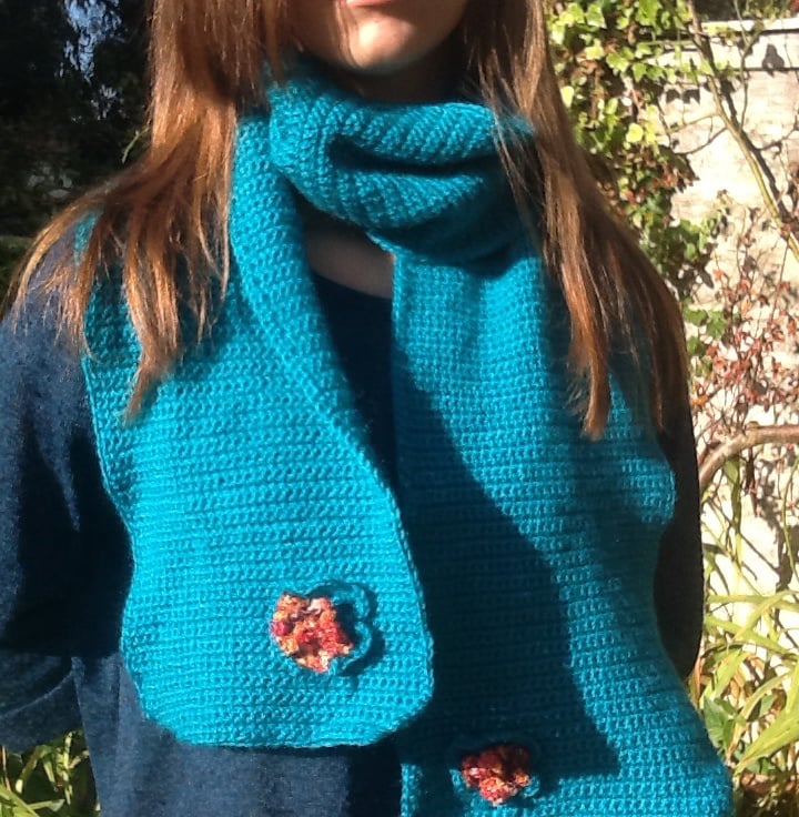 The Emerald toned yarn for this crocheted scarf a Acrylic and is wonderfully soft and is accented at either end with a double floral accent, the centre portion in a wonderful autumnal toned yarn, for those who love autumnal tones.