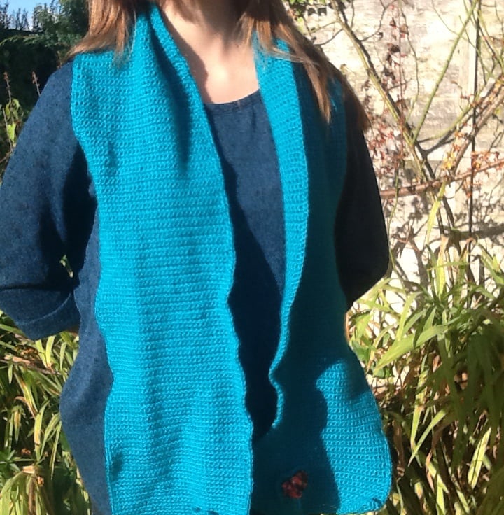 The scarf is in a classic style. Crocheted in continuous rows on a medium hook to give a loose stitch & then edge crocheted to give a finished crocheted frame to the scarf, it is lovely & soft and warm without the bulk and weight of a thick yarn. There are no seams or joins in the scarf.