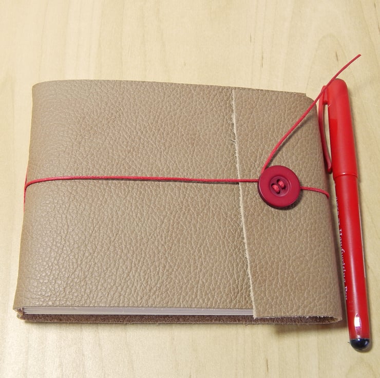 An Artist's Pocket Sketchbook, with a wrap-round cover in toffee coloured leather, with red linen binding.