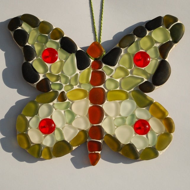 We have made this delightful butterfly mosaic from pieces of beach glass which we have tumbled until they are rounded and smooth. The glass has come from old bottles and is a variety of shades of olive, brown, aquamarine and white. We have used flat red glass beads to provide a splash of colour on the wings. The back of the mosaic is top quality laser cut plywood with an attractive brown edge.