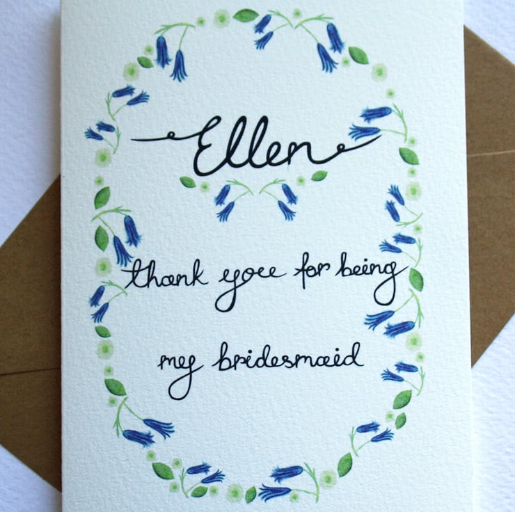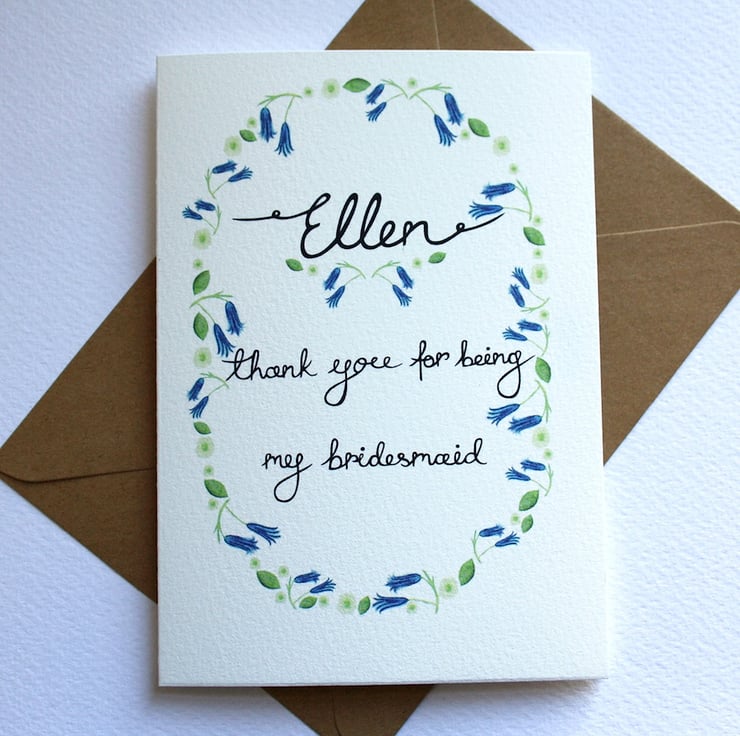 Pretty personalised thank you for being my bridesmaid card with pretty hand lettering and watercolour wildflower illustrations.
