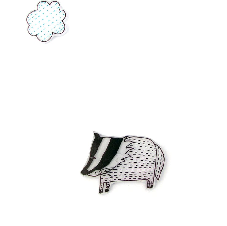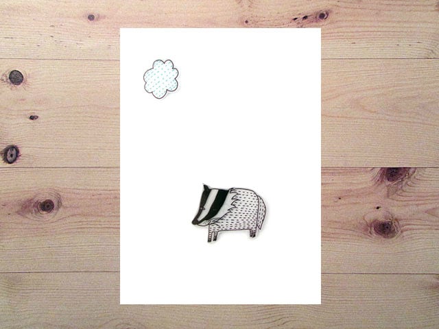Bob the badger and cloud have been hand drawn on shrink plastic and are on an A6 sized white card with envelope.