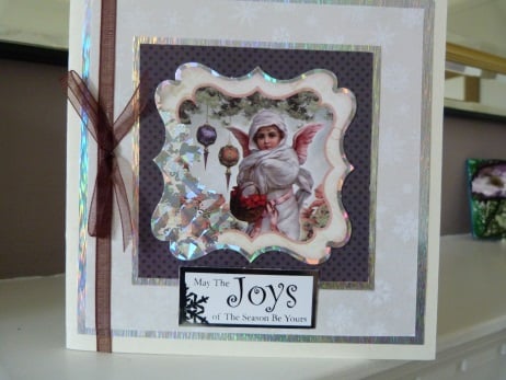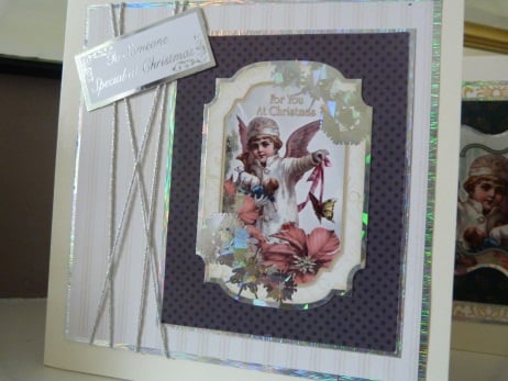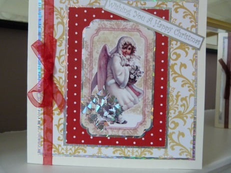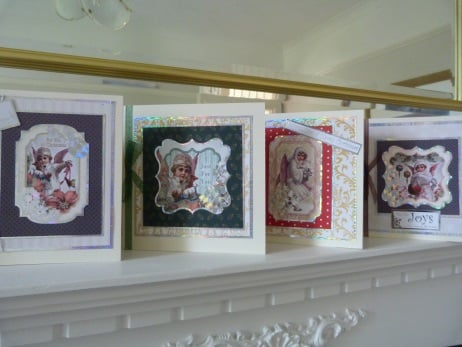 A quality pack of 4 vintage cards all containing foiled angels which have been mounted onto co-ordinating Christmas patterned paper, then onto silver mirri card, more patterned paper, more silver mirri card and then onto quality cream card. 3 finished off with co-ordinating organza ribbon and bow and 1 finished off with silver cord.