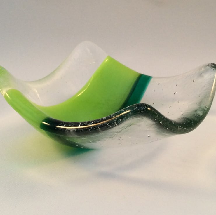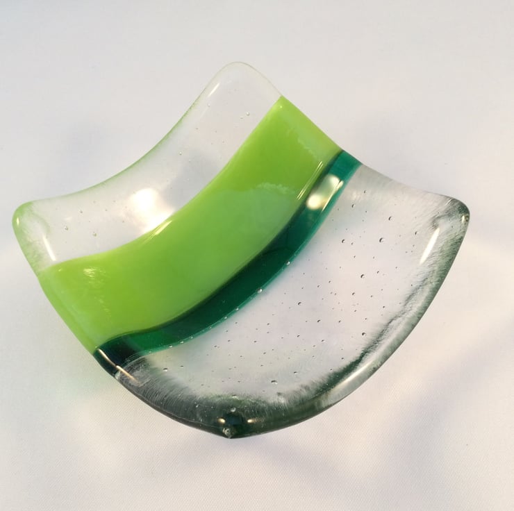 A lovely 8cm square trinket dish with light and dark green strips. Perfect for rings 'n' things or a tea light holder. This was made by cutting two layers of glass strips and firing in the kiln at 800 degrees celsius before refiring to slump into shape. The total firing time was 24 hrs to get to the finished result.