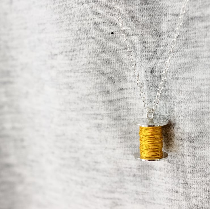 I grew up within a family environment of three generations of needlewomen and at an early age became fascinated with my Grandmother’s talents! My love of textiles and haberdashery stem from the pleasure of rooting through a button box of brightly coloured ‘treasures’, the tangled skeins of embroidery threads and the collections of innumerable jewel-coloured reels of cotton, which is what this pendant is inspired by.