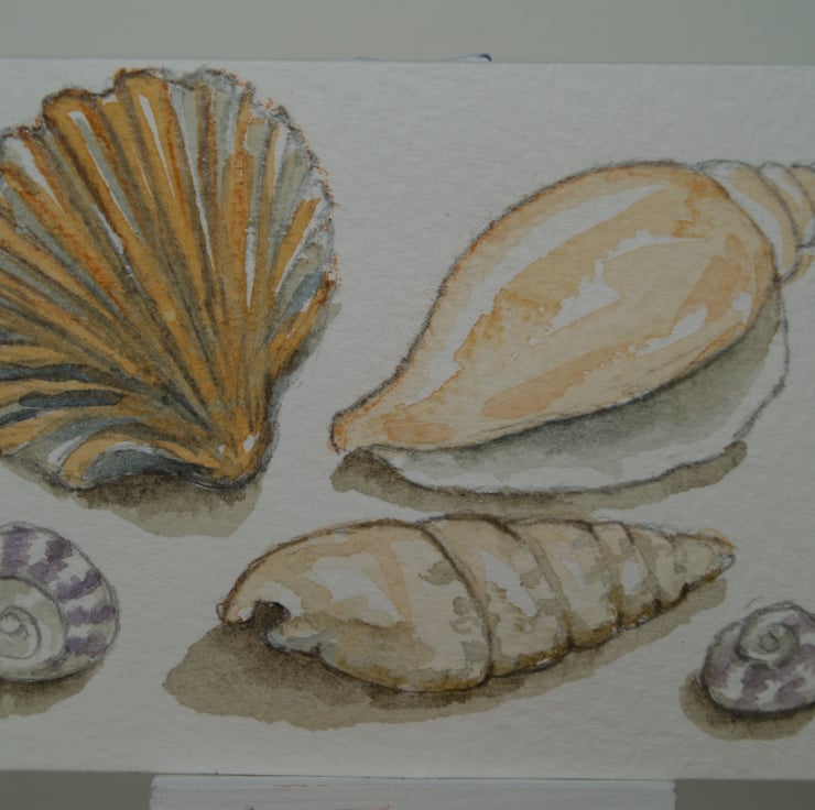 Each shell was collected on holiday. I pick up a shell if I think it looks pretty, or unusual, or both! I decided to paint some of my favourites and this ACEO was the result.