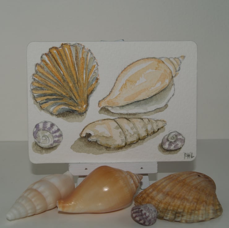 This ACEO is an original, hand painted watercolour of a collection of shells, which I have collected on holidays over the years. It measures 2.5 x 3.5 inches (63 x 89mm).