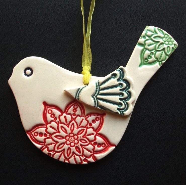 This cute little bird is made from white earthenware clay and decorated with bright, bold pattern.