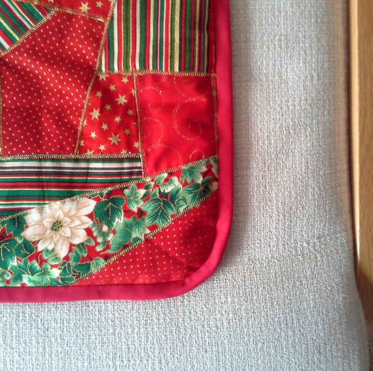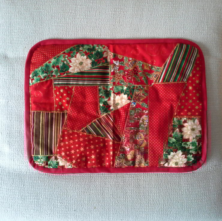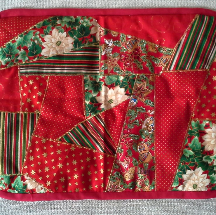 It is a random patchwork table mat that is made from a selection of festive material and each patch is edged in zigzag gold thread. The mat is backed in a plain red fabric, is lightly padded and has red binding.