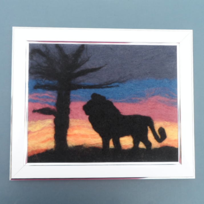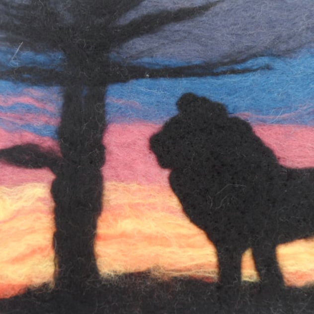 A fabulous wet felted picture depicting a lion in a beautiful sunset.