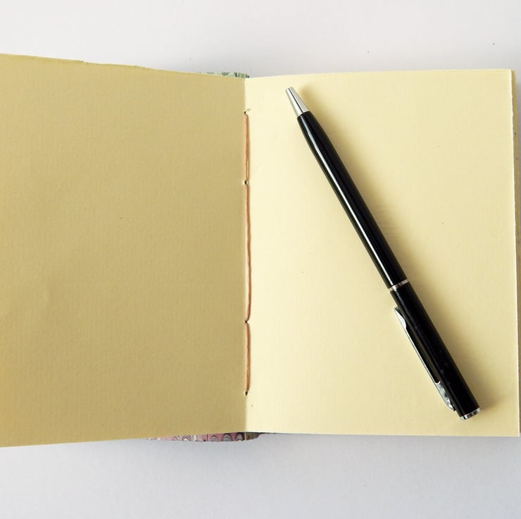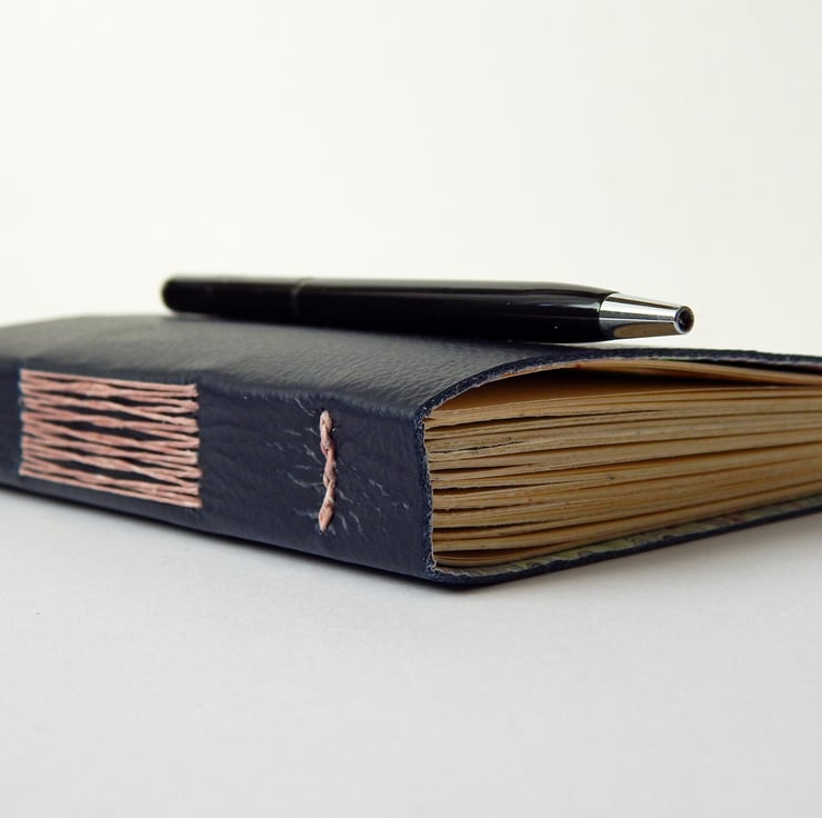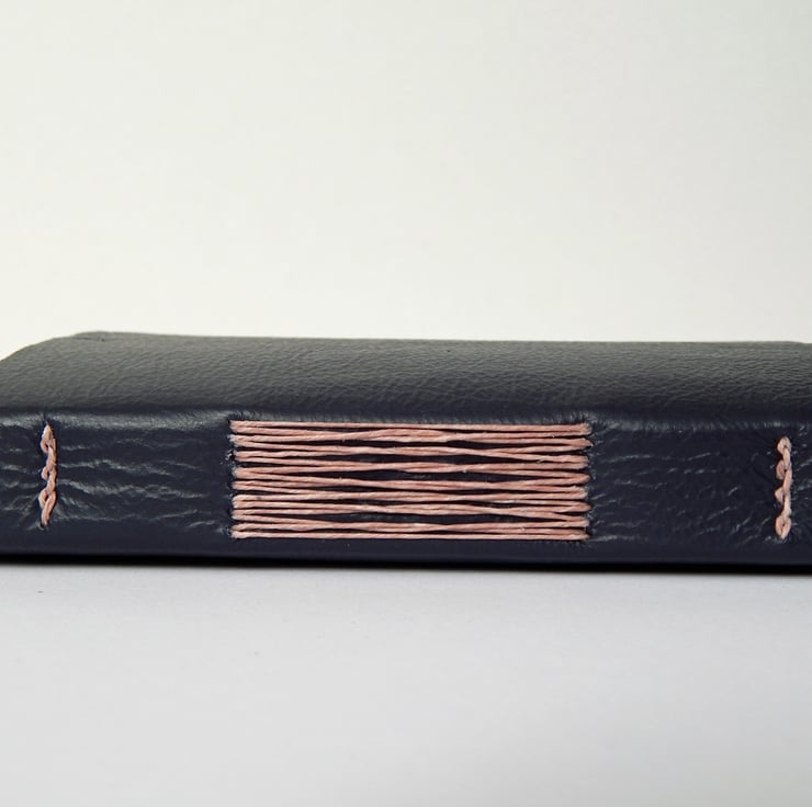 The pages are hand stitched, in a traditional English style Longstitch, with smokey pink Irish linen thread.