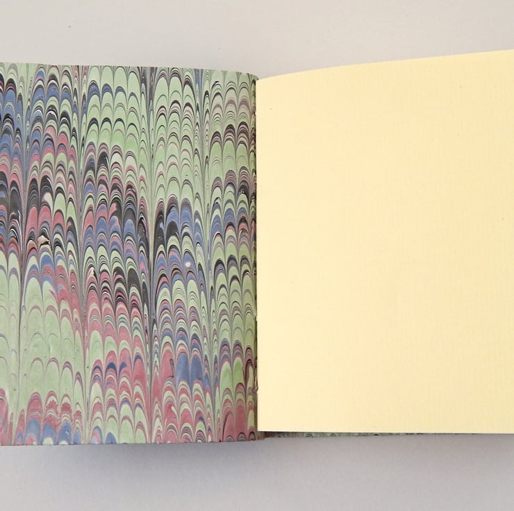 Navy Blue Leather covers, with a lining of marbled paper. This paper is marbled by hand, using traditional methods, by artist Rhonda Miller of "My Marbled Papers". It is very lovely, with a beautiful multi-coloured design in soft green, charcoal, smokey pink and mauvey-blues.