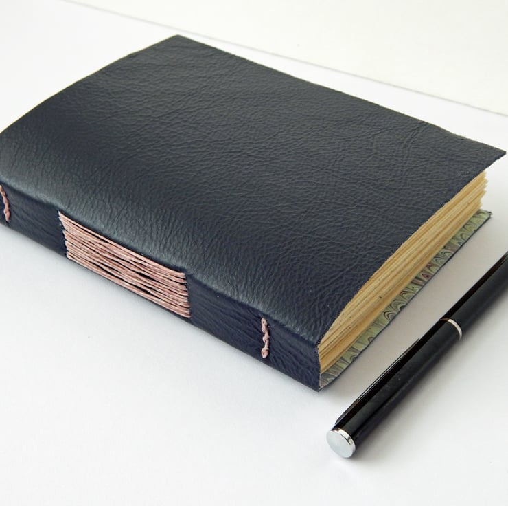 A hand bound, Longstitch Journal or Notebook, with covers of soft, high quality leather, lined with hand marbled paper.
