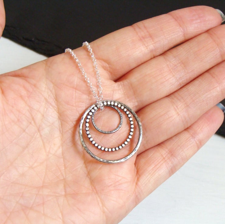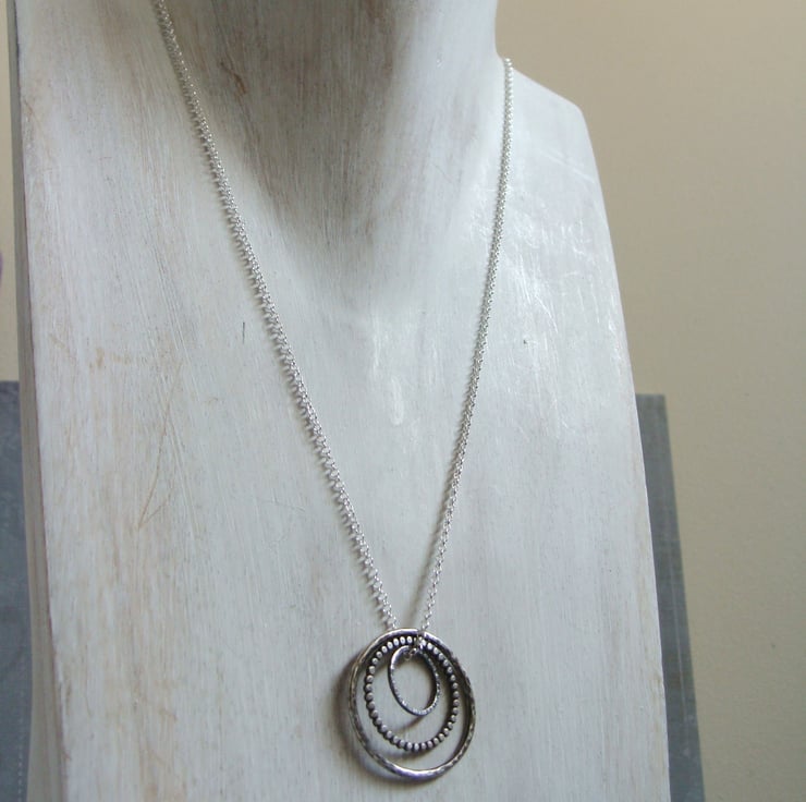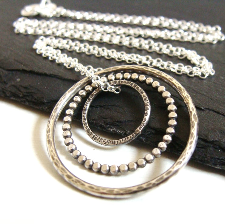 The largest has been hammered to give a random dented pattern with a ball hammer on both sides. The middle circle is made from pearl wire and has been slightly flattened whilst the smallest has a woody bark-like texture applied to one side only with the reverse remaining black from oxidation.