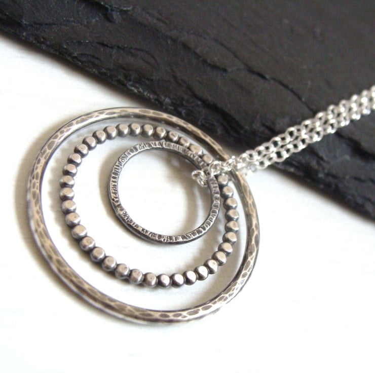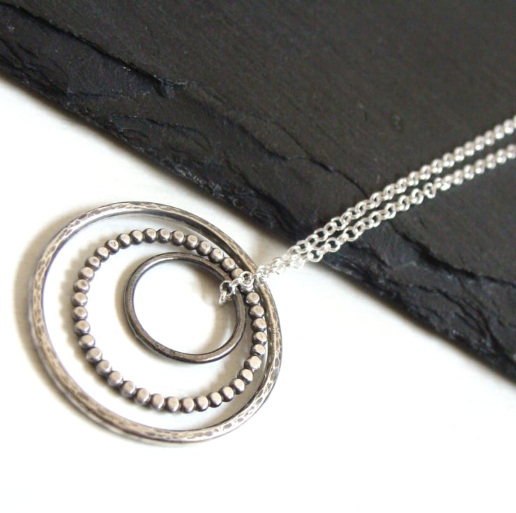 Care: this piece has been oxidised to give the silver a dark finish. This patina has been sealed with Renaissance wax which will help to preserve this but as the circles jangle together they will slowly start to reveal brighter, silver highlights. This necklace will evolve as you wear it and no two will end up the same! You can protect this patina for longer though by doing some simple things:- take off when bathing/showering/applying perfume and store away in a jewellery box when not in use.