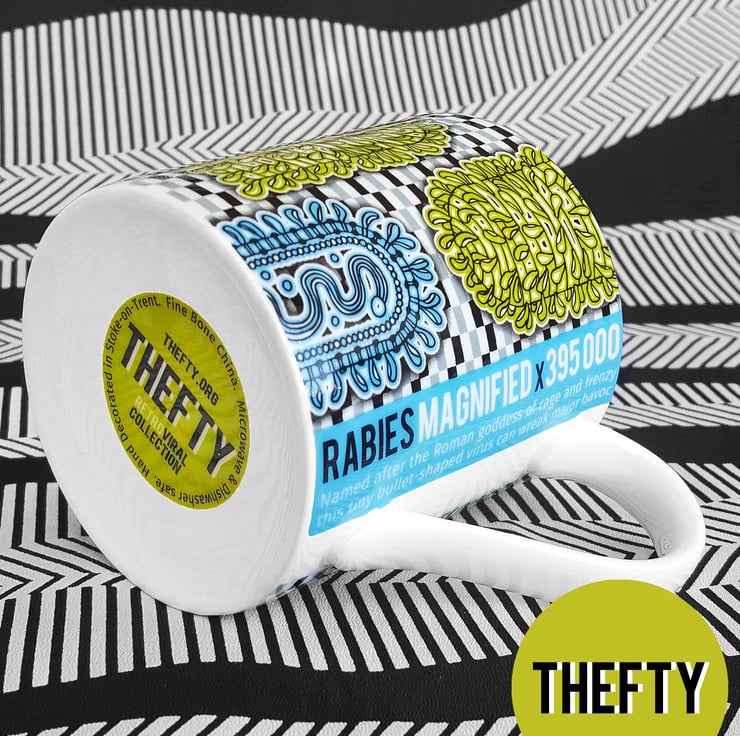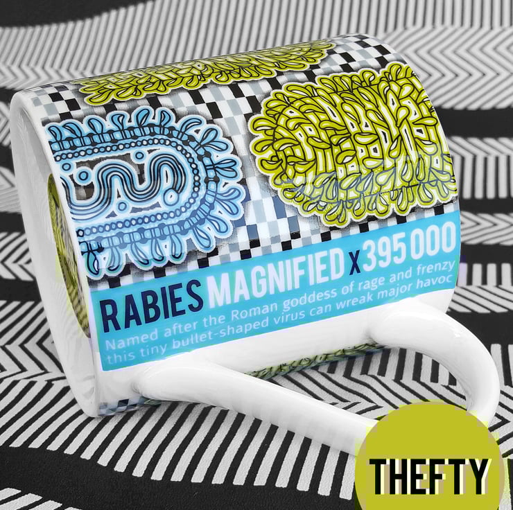 Science mug alert! This mug features an artist's colourful spin on the microscopic structure of the Rabies virus.