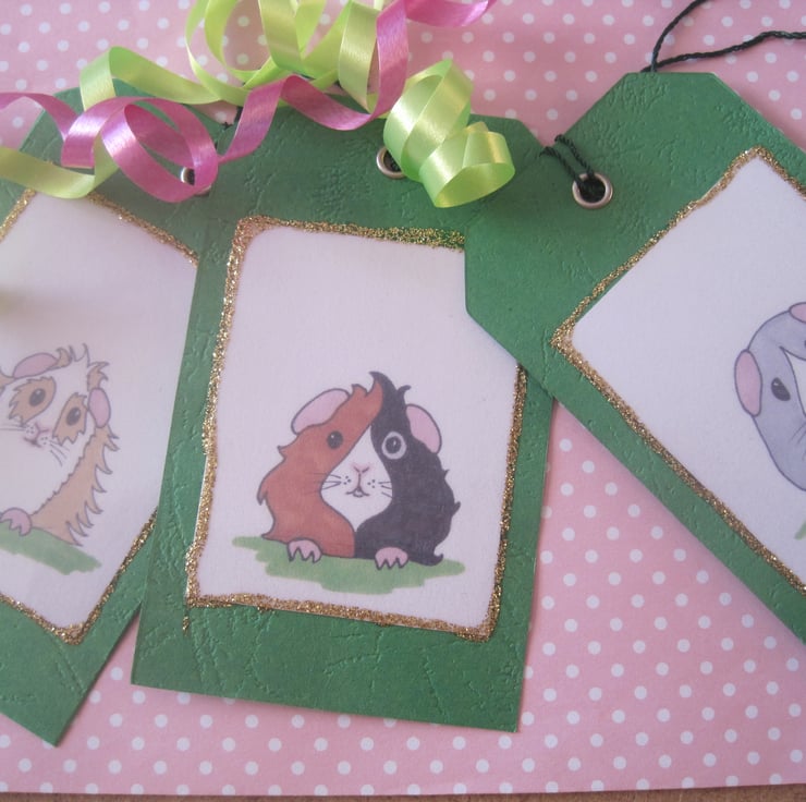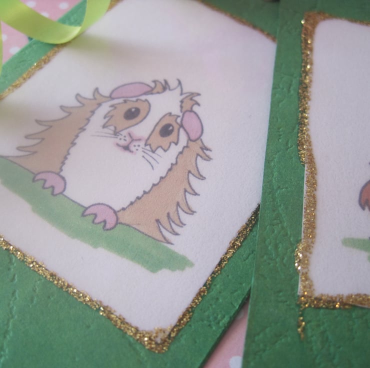 A set of three guinea pig gift tags, featuring cartoon style guinea pigs on green tags.