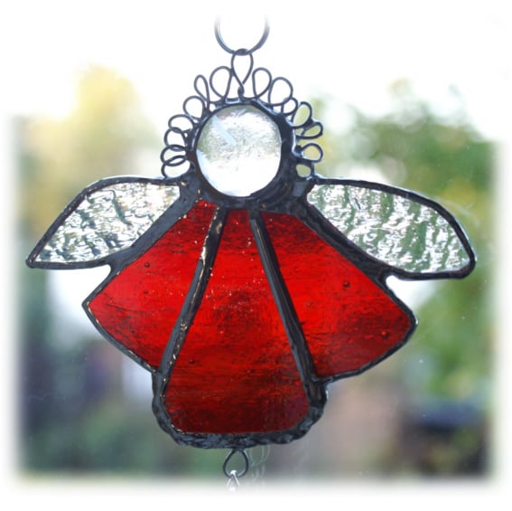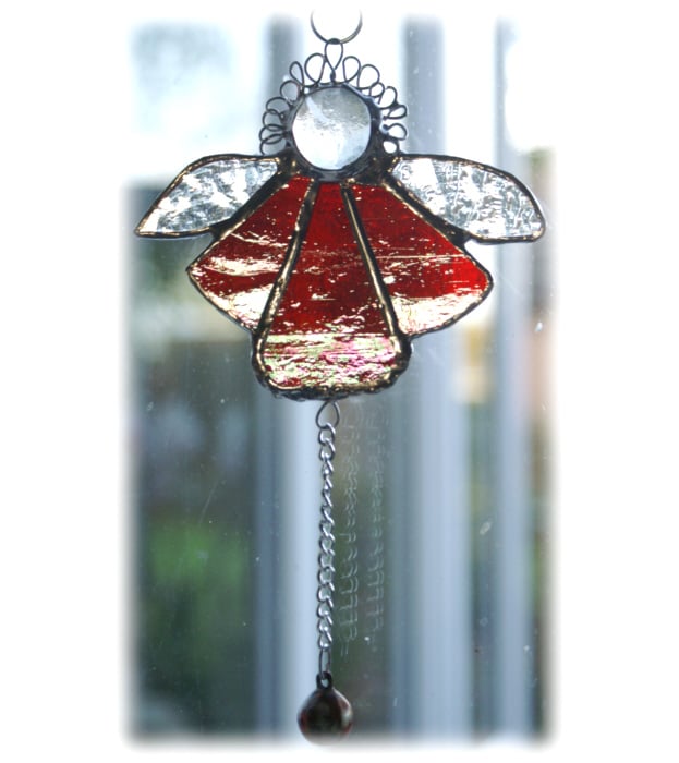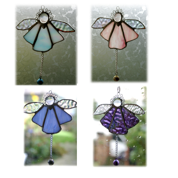 This is a stained glass suncatcher, an angel, made using the Tiffany copper foil technique.