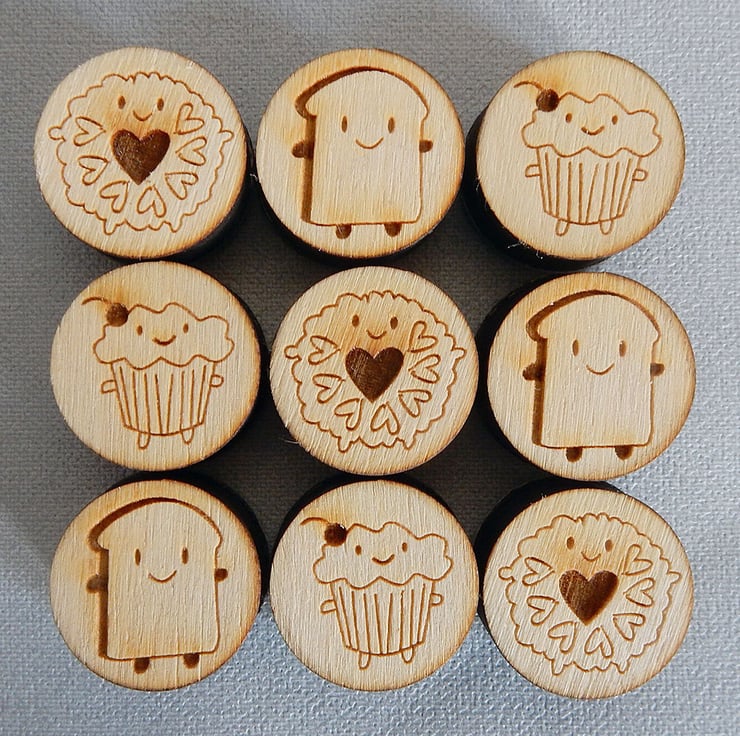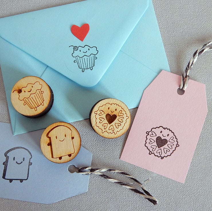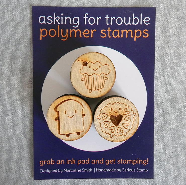 I've partnered with Serious Stamp to make my characters into rubber stamps. This stamp set features Cakeify the happy cupcake, Jammie Dodger and Bread Slice and is perfect for cards, crafts and journalling.