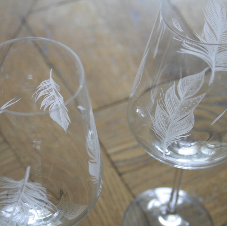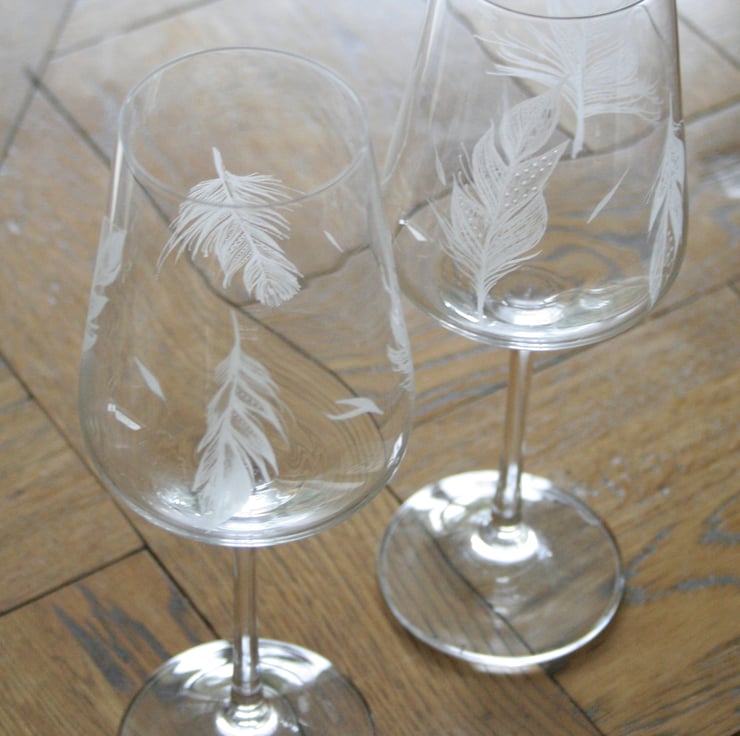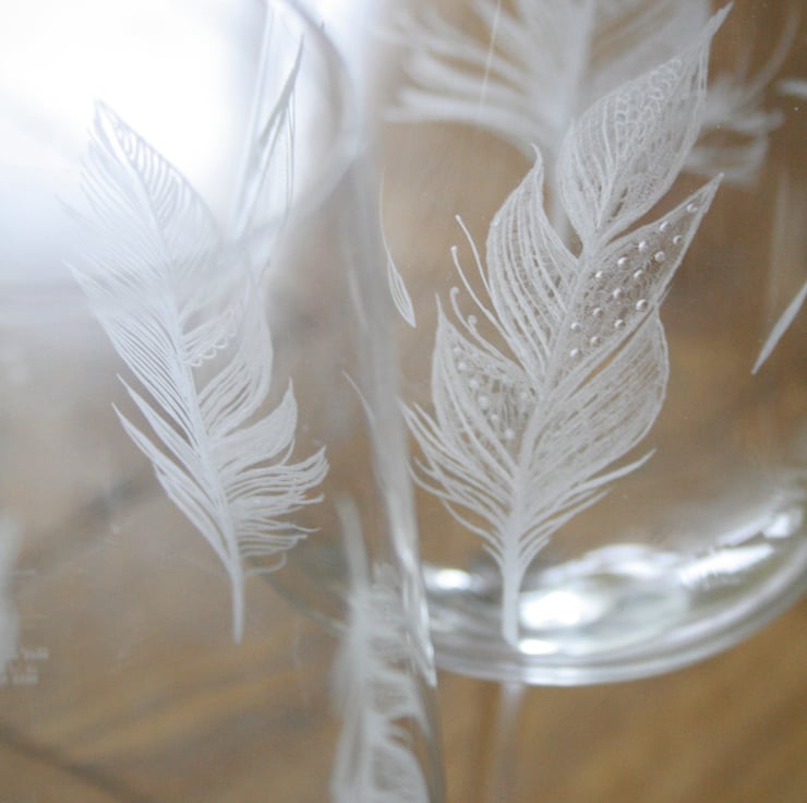 Hand engraved feather on each glass, Subtle delicate engraving, that cannot be removed.