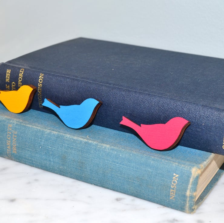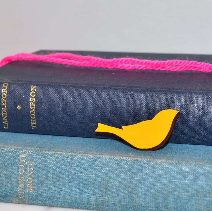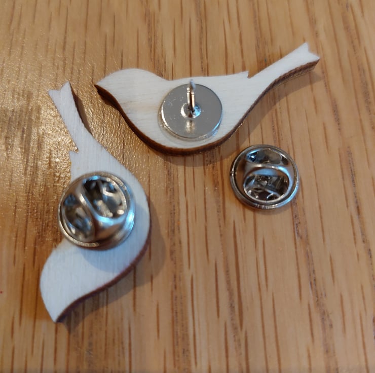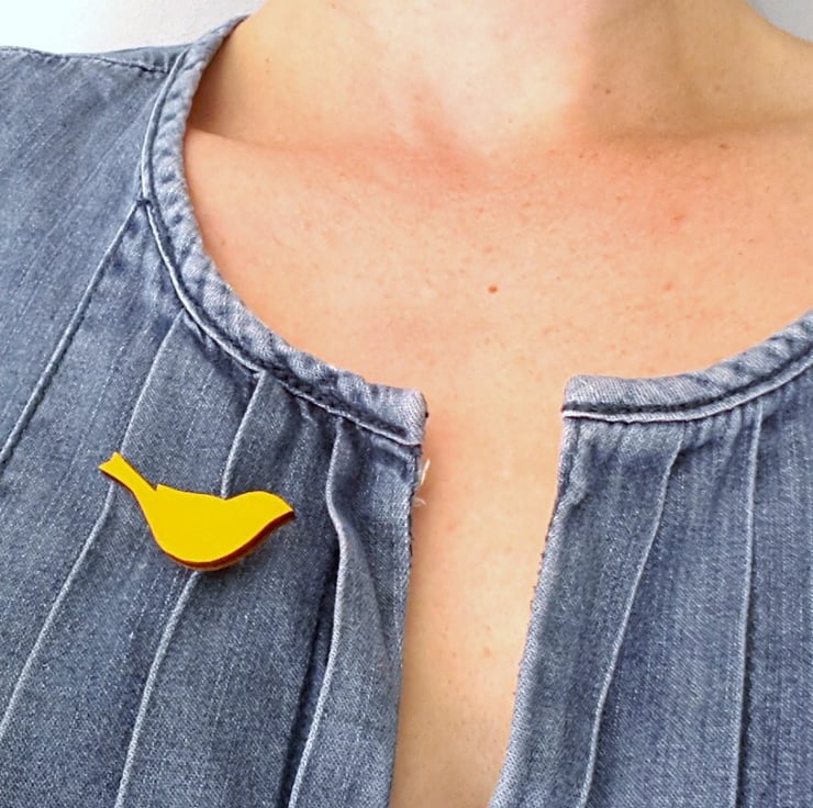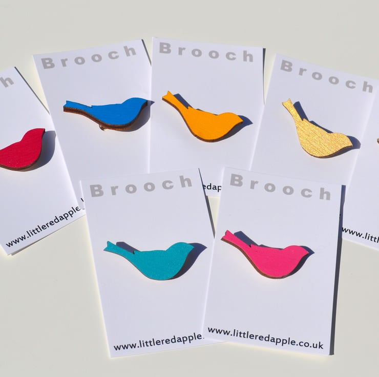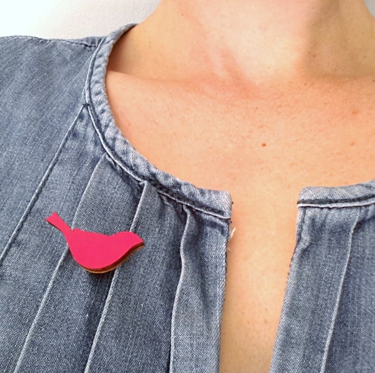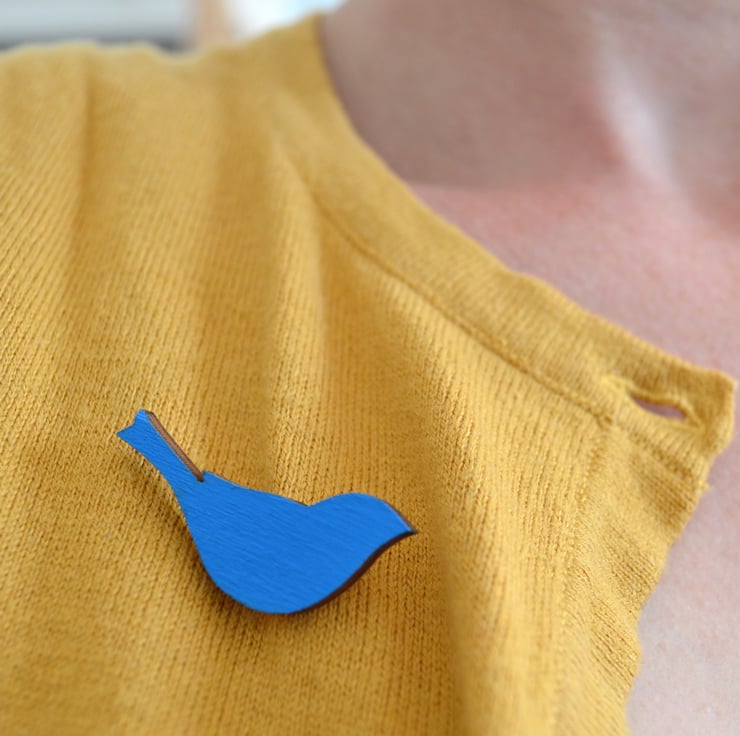 Simple painted wooden bird brooch, laser cut from 4mm thick Baltic birch plywood. It has a crisp caramelised edge from the laser-cutting process and is painted with two coats of acrylic paint and then lightly varnished to seal it.