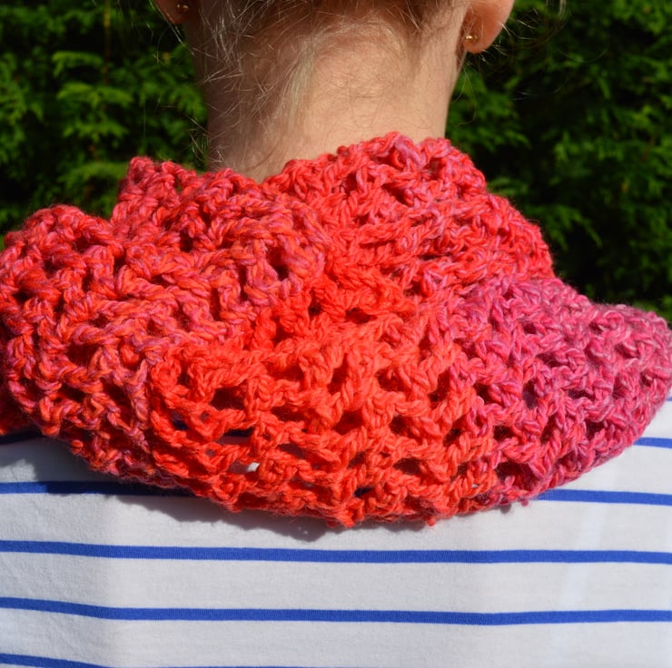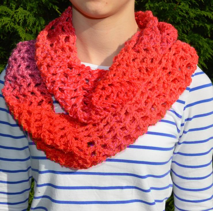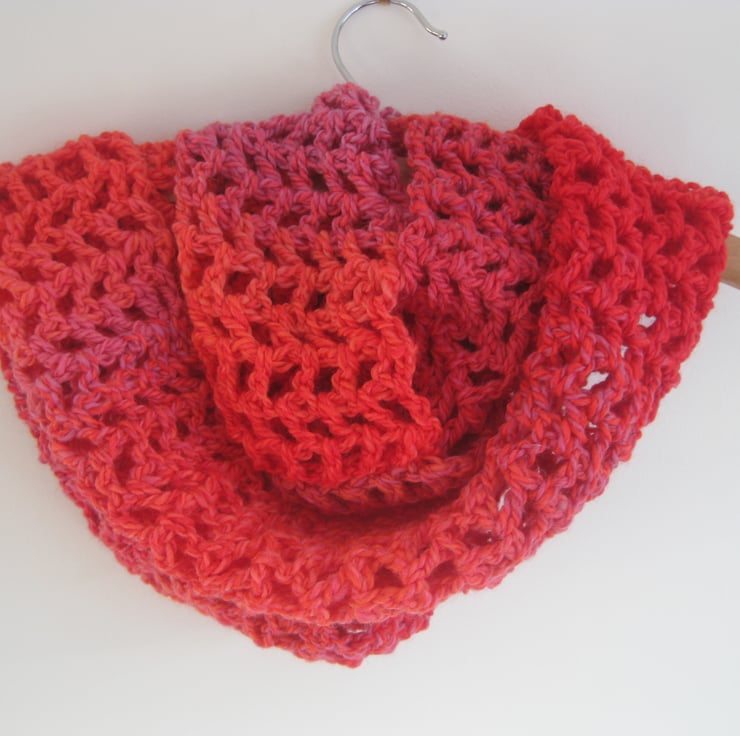 A lovely soft infinity scarf in pink, orange, red and lilacs.