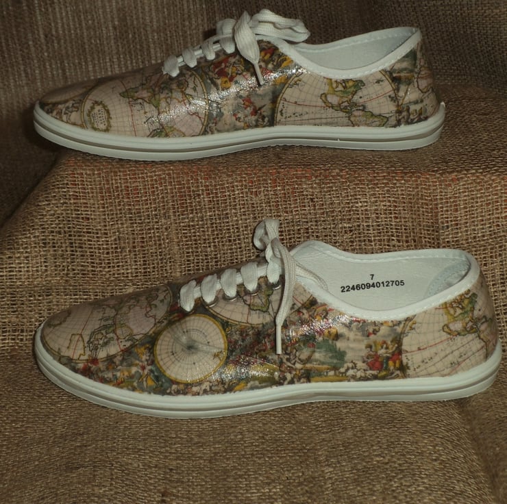 Different views of an old world map are used on each shoe front, with background classical images of sea and country scenes on other parts.