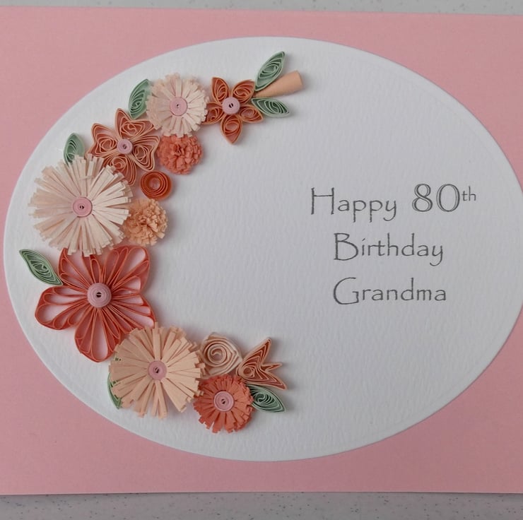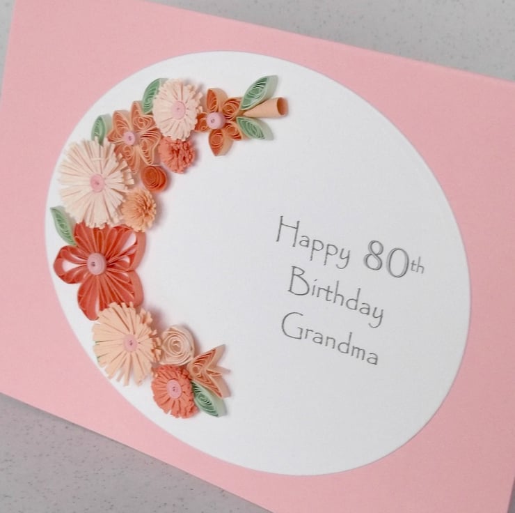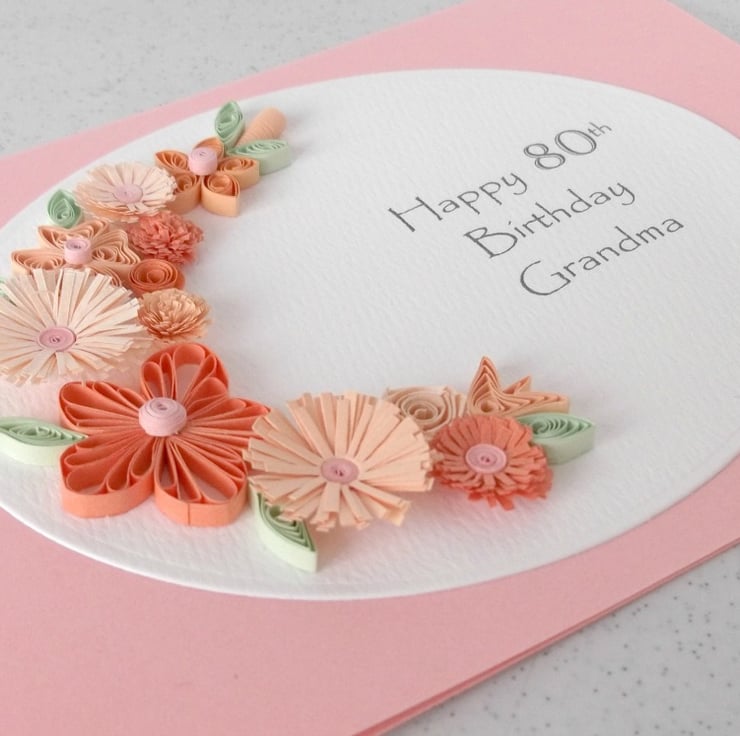 All the quilling on this card is handmade by me! Each petal, bloom and leaf is handrolled from strips of coloured paper. The result is a beautiful original card which makes a great keepsake for the future.