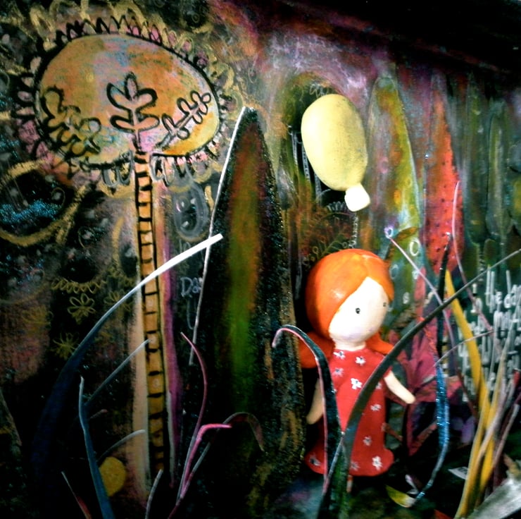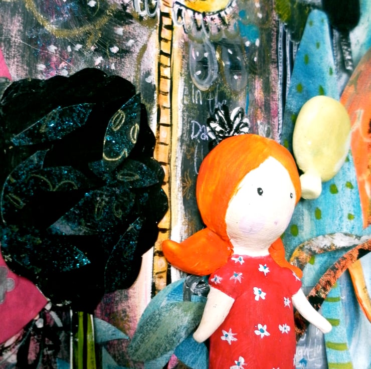 A original piece of charming story art. Designed and created by Nina of Marmalademudpie & Me for photography intended for a childrens story book. The scene and the ceramic 3d handmade character little Mabel are all as a 3D set in a box frame that is made from cardboard. The trees and grass are collaged from thin card and decorated with paints, inks glitter. This is a most charming scene and I am now happy to let it come out of its wrappings and to be homed with an admiring owner.