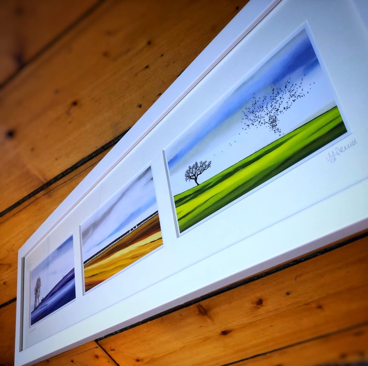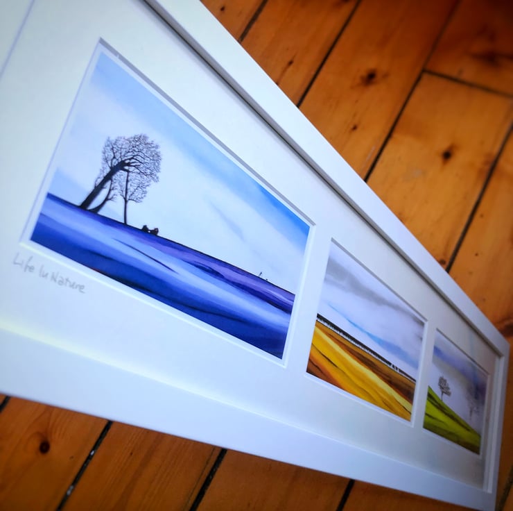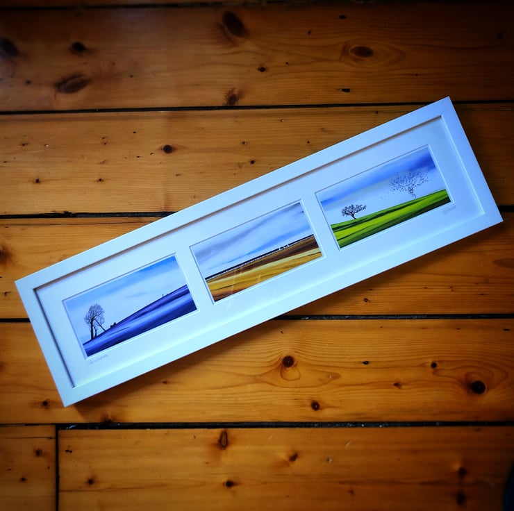 Bespoke framed in white with three aperture mount. Roped and ready to hang.
