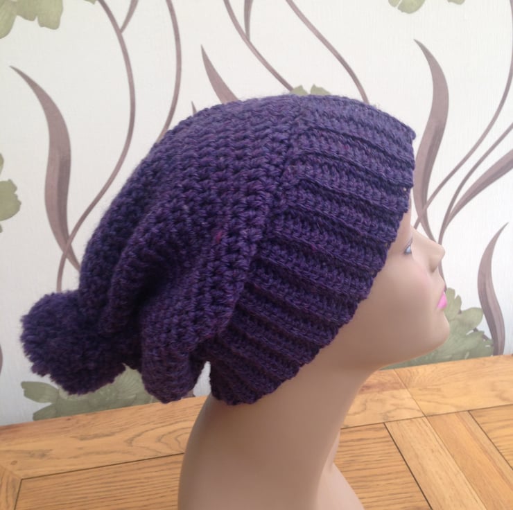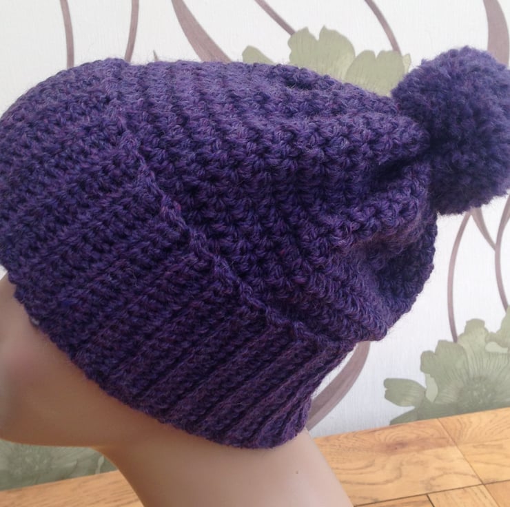 This crochet hat is made in a lovely purple 100% wool yarn and can be worn in two different ways with rib band turned up or worn down as a slouchy. The hat is one-size only to fit ladies size teens to adult.