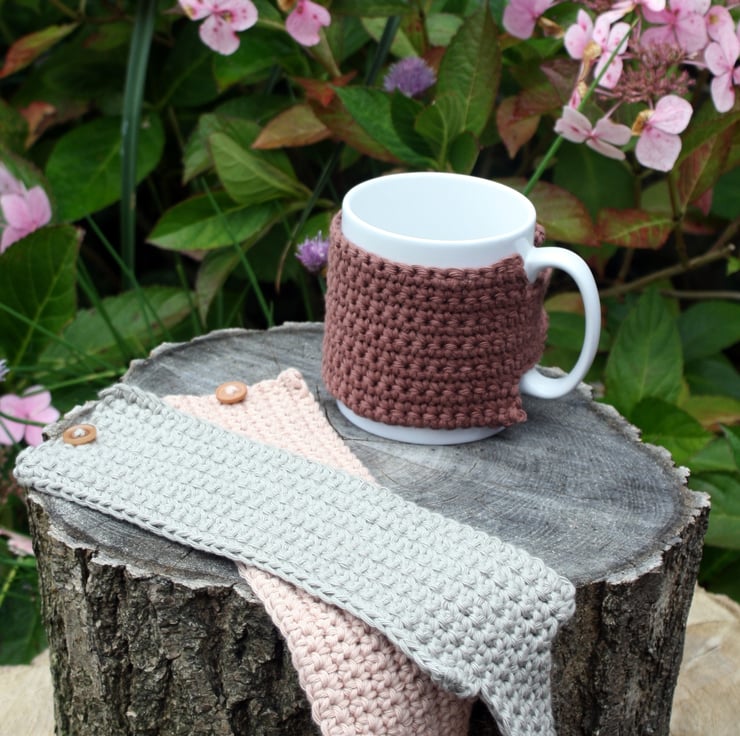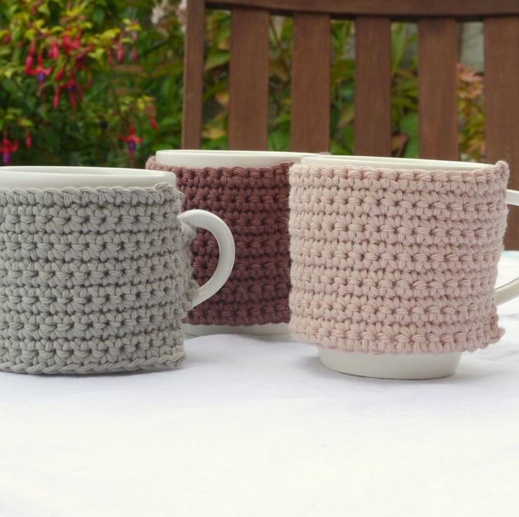 This set of three muted tones mug hugs is hand crocheted using good quality 100% cotton. They each measure approx 3in high and will fit a standard 3in diameter builders style mug.