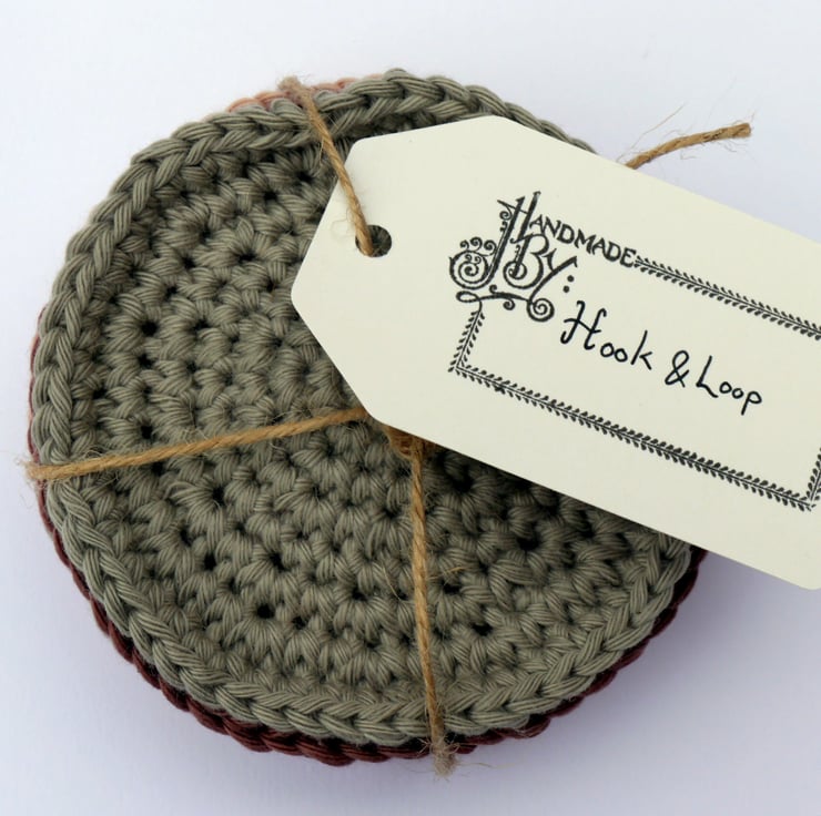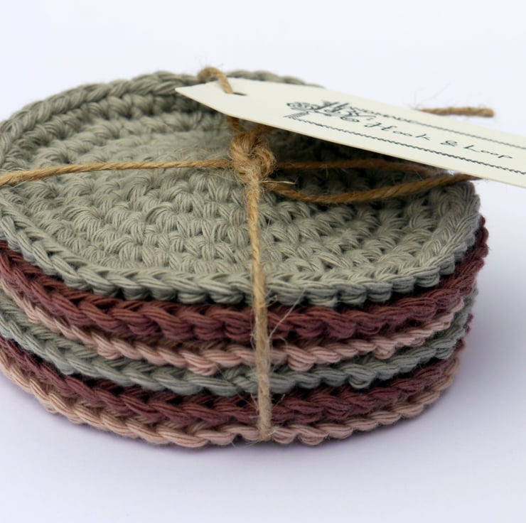 This lovely rustic set of six hand crocheted coasters is made using good quality 100% cotton. There are two of each colour each measuring approx 9cm diameter.