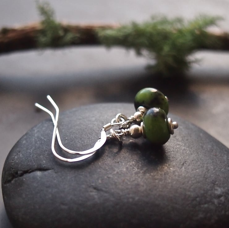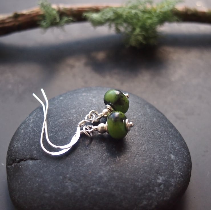 Intense forest green chrysoprase with black markings contrast beautifully with the sterling silver beads. Simple and striking these are great for everyday.