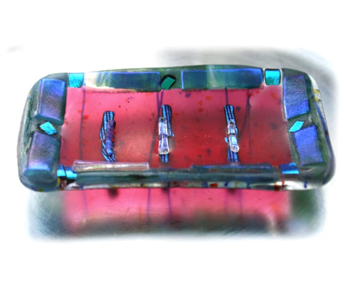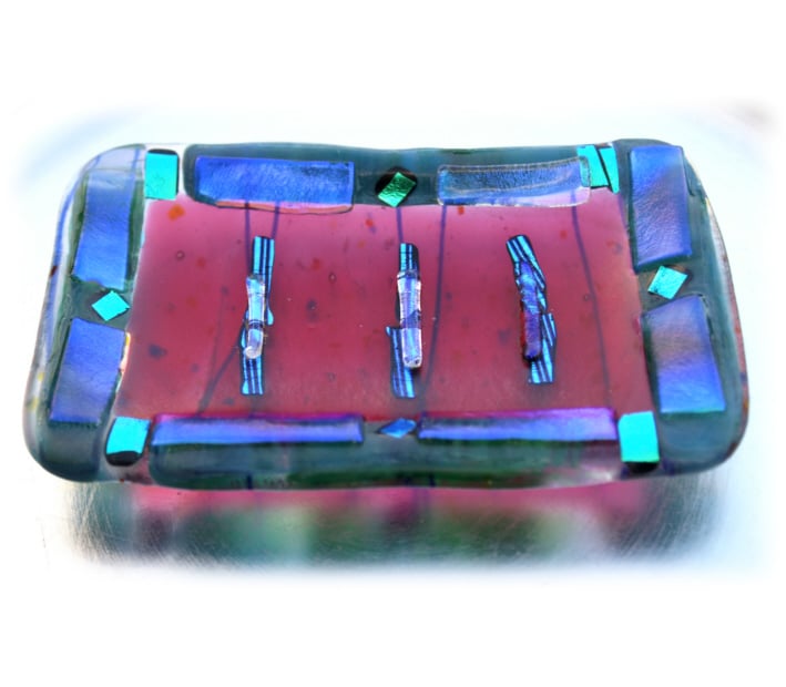 This very pretty dish has a base of clear collage glass which is ready decorated with blue streamers and multi-coloured frit. This is topped with delicious raspberry clear glass and then bordered with streaky deep emerald further topped with clear iridescent dichroic..