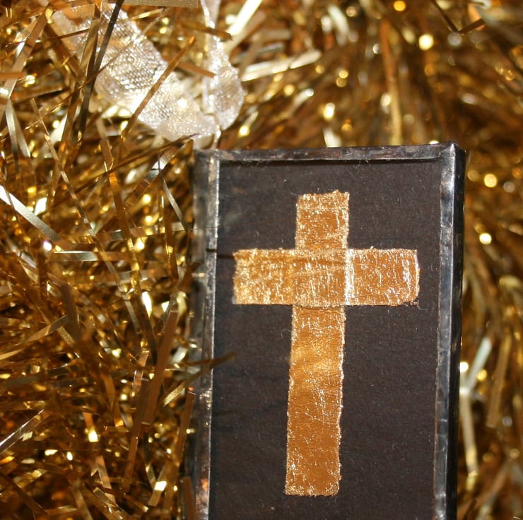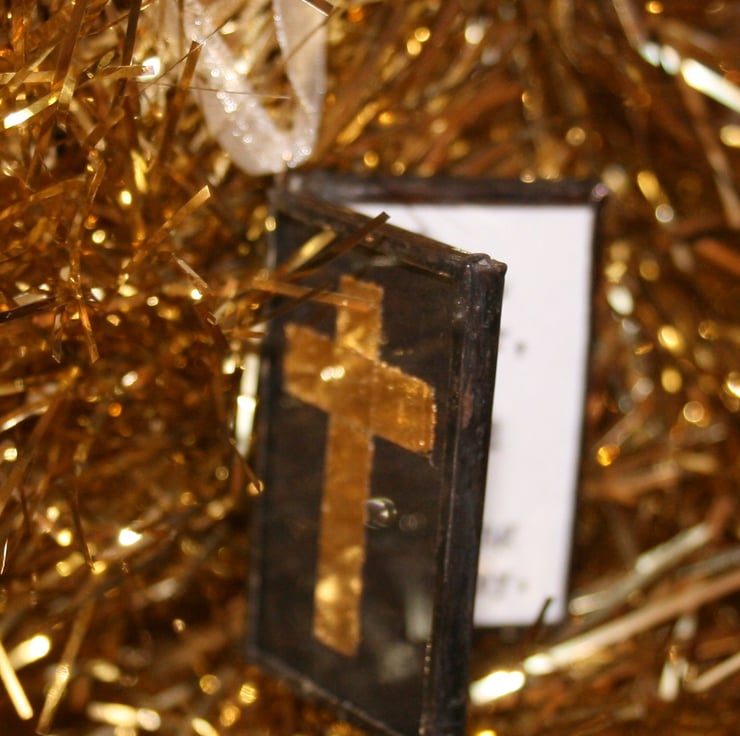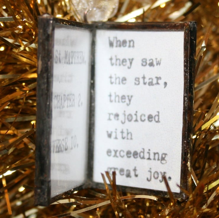 I have cut pieces of glass to 1.5" x1" size, between them I have added black card with a gold leaf (sorry, not real gold leaf) cross on the front. Inside is a quote from the Bible about the story of the 3 Wise Men searching for Jesus,on the left page it reads St Matthew, Chapter 2. Verse 10. And on the other page it shows a quote " When they saw the star, they rejoiced with exceeding great joy."