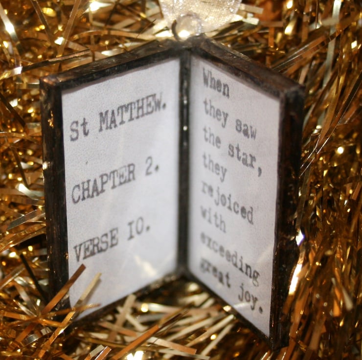 Here is a decoration along the same lines as the crosses I have made for a Christmas tree. I have made a mini Bible containing a inspirational nativity quote.