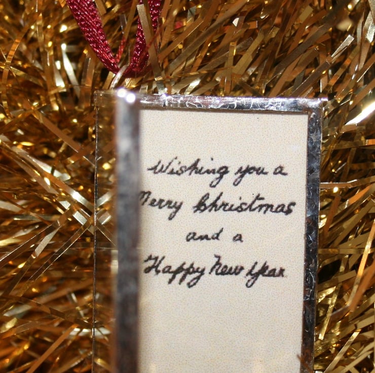 I have soldered it at an angle as if its on display on a mantelpiece. Inside it has a sentiment say " Wishing you a Merry Christmas and a Happy New Year" which I have taken from a handwritten postcard I have dated 1926.