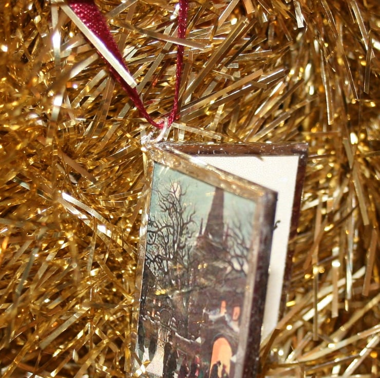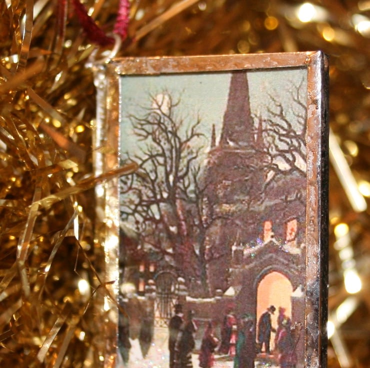 I have cut pieces of glass 1.5"x 1" in size and sandwiched an image inside of a snowy, Victorian Christmas scene of people waiting to enter their church.