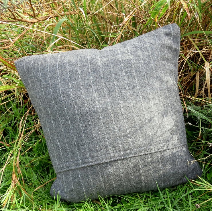 There is a deep envelope opening to the rear of the cushion, which is the same pinstripe grey fabric as the front.