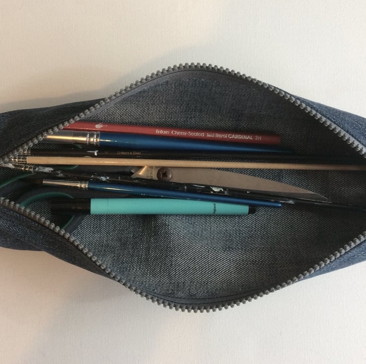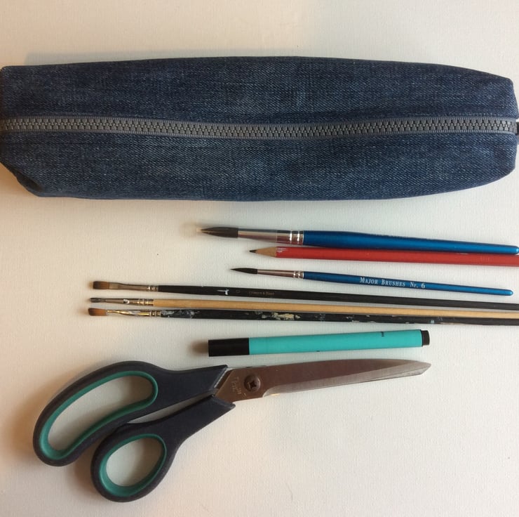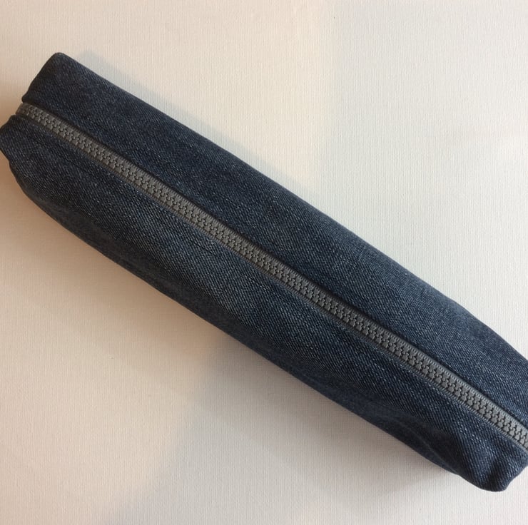 Useful, extra long pencil case or knitting needle case made from recycled denim with a grey zip. The case measures 28cm x 5cm x 5cm and is unlined. As you can see from the photo it is large enough for medium length paint brushes, scissors and the usual pens and pencils (these are not included in the sale).