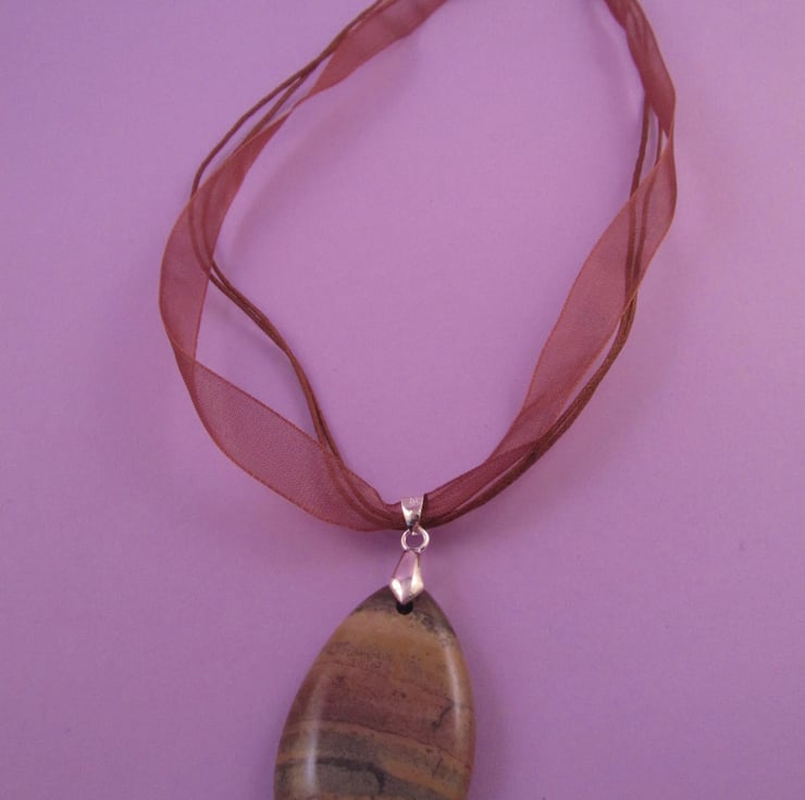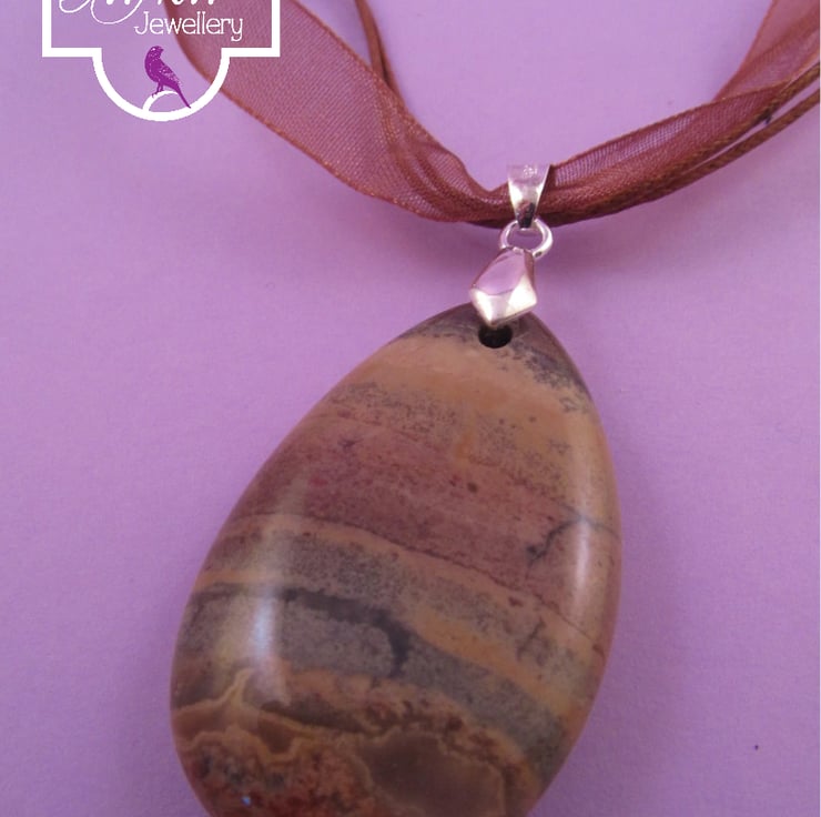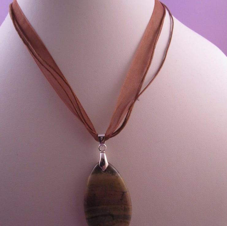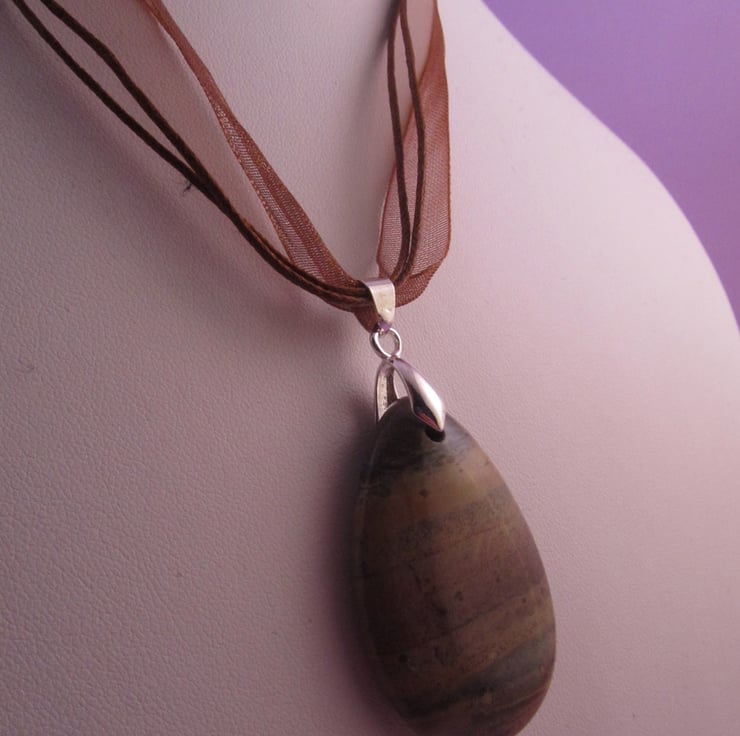 This is a beautiful brown jasper pendant necklace. It is created using real jasper gemstones, silver plated brass, tibetan silver, silver plated copper, and organza ribbon. The pendant has a stunning horizontal striped pattern in various shades of brown that looks like the surface of an alien planet, and is double sided. This means that it can be worn either way and still look good. It would look great with casual wear, or just to add that certain something to an outfit.