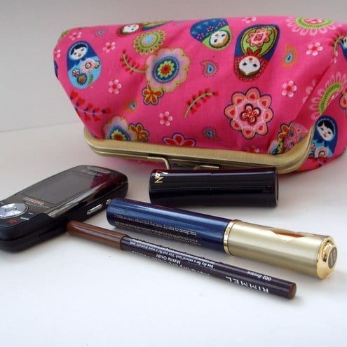 Perfect little clutch for your mobile phone, keys, sunglasses,change and credit cards or even a make-up bag. Pretty pink Russian doll fabric with contrasting lining, padding and metal frame clasp.