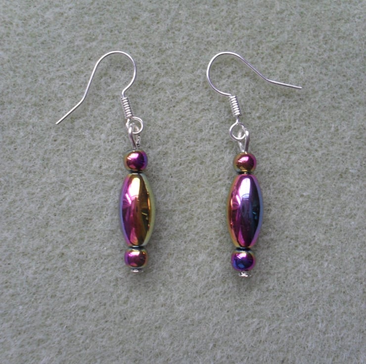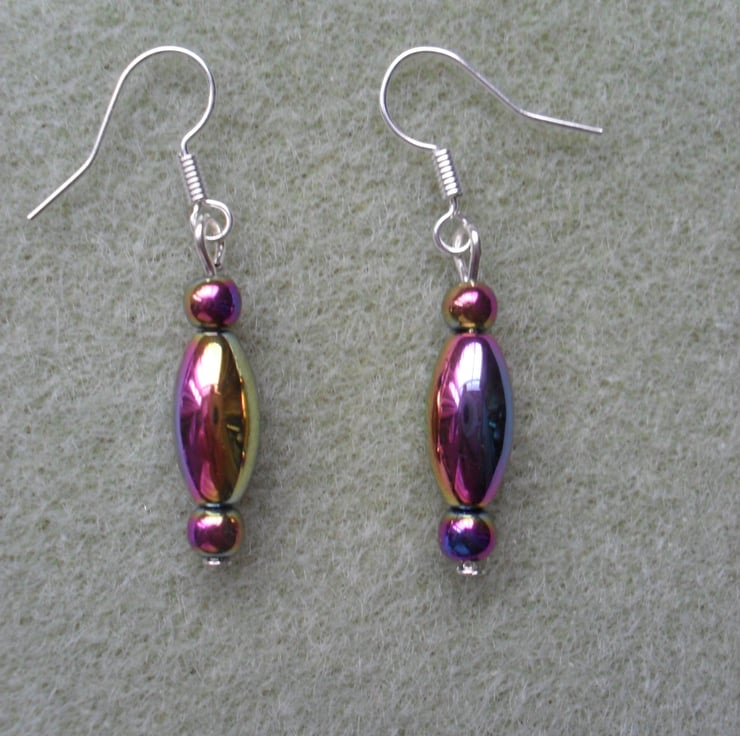 Rainbow Haematite earrings with haematite rice beads and round beads.